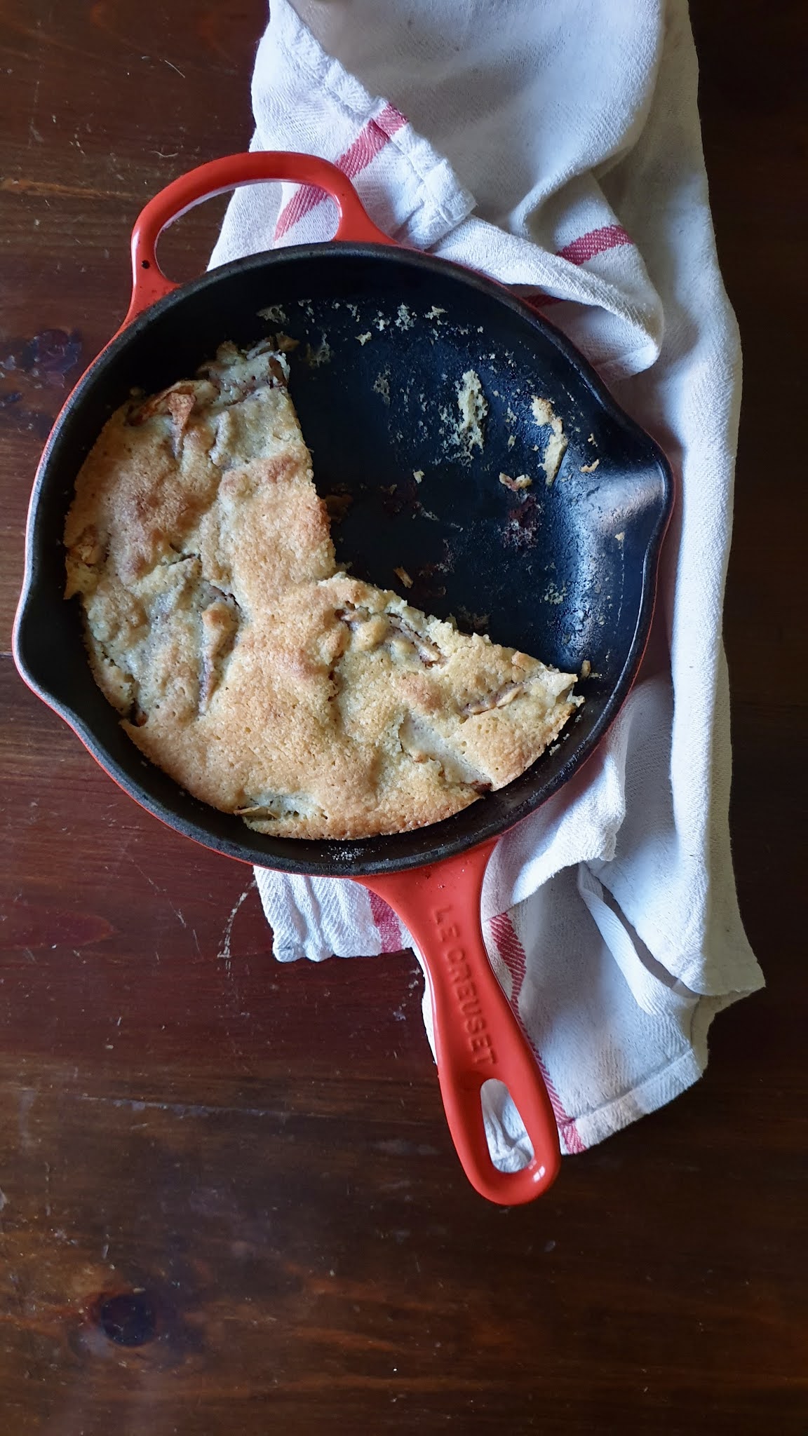 Não posso estar em casa sem maçãs. Os miúdos vão continuamente à fruteira buscar fruta, mas as maçãs tem um lugar de destaque, porque basicamente é pegar e comer - sendo que até as coloco na fruteira já lavadas, porque muitas vezes se esquecem de as lavar. A Benedita é a rainha das maçãs. Vai, tira uma, mordisca e come, mas raramente as come até ao fim. Acabo com várias maçãs ratadas, que guardo e aproveito para fazer puré de maçã, por exemplo. Desta vez, acabei a fazer um bolo na frigideira, para aproveitar o forno quente do jantar.