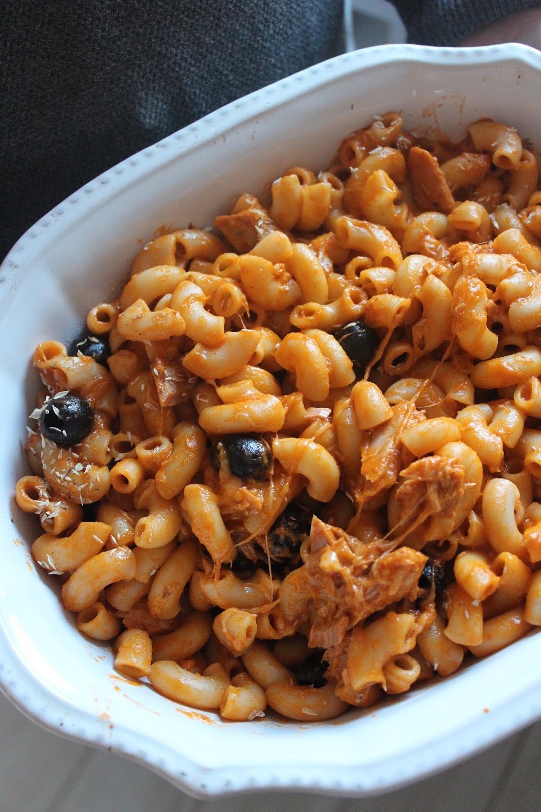 Cotovelinhos com Molho de Tomate, Atum, Azeitonas e Mozarella