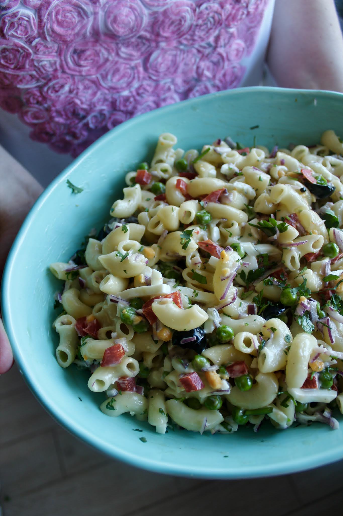 250g de massa de cotovelinhos3 ovos1 chávena de ervilhas1 cebola pequena1/2 chávena de azeitonas pretas100g de maionese caseira ou de compra1 colher de chá de mostardasumo de limão q.b.sal e pimenta q.b.1 dente de alho1/2 pimento vermelhosalsa picada q.b.azeite q.b. Preparação: