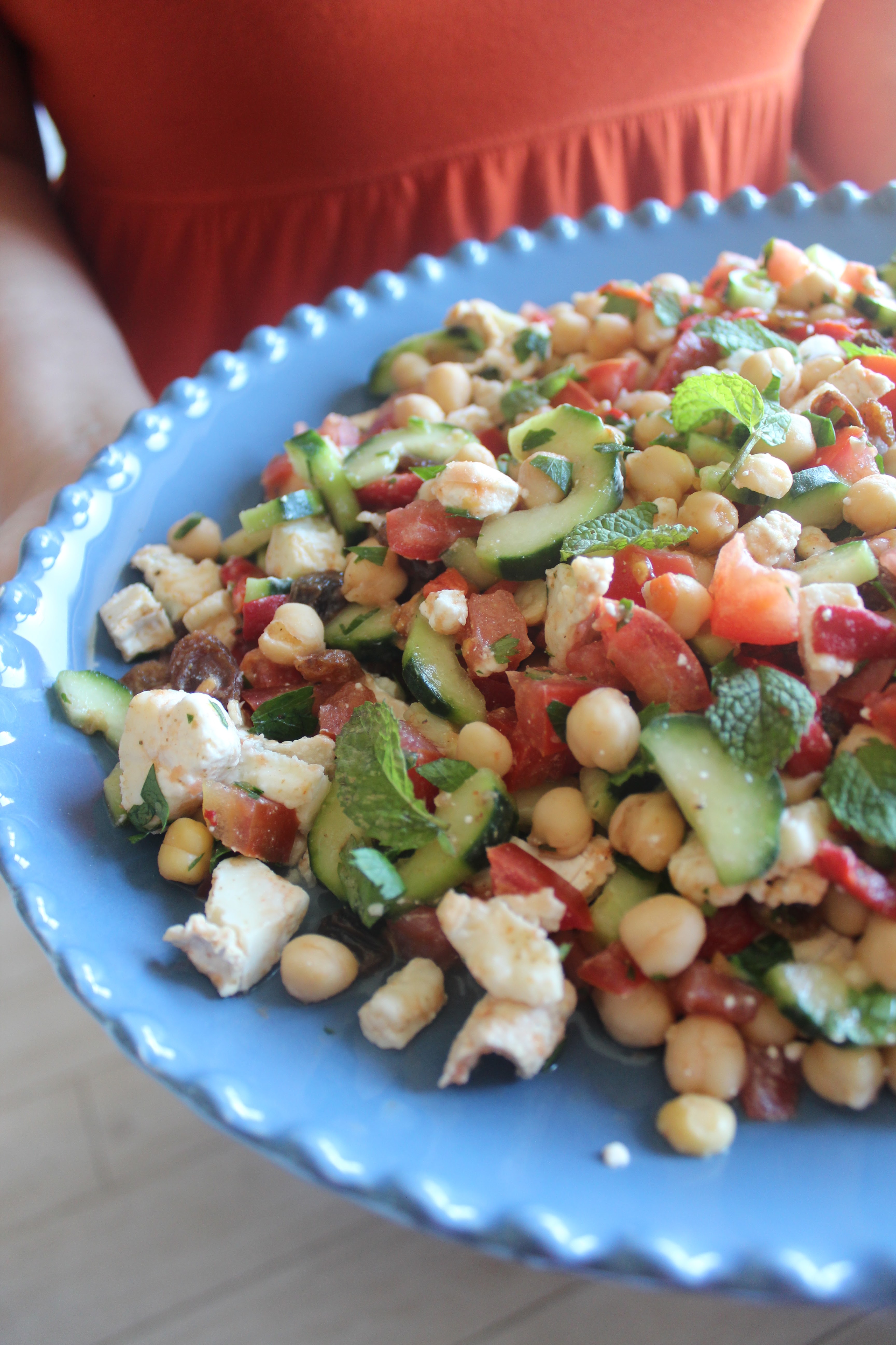 400g de grão de bico cozido2 tomates médios1 pepino50g de passas2 pimentos assados de conserva200g de queijo de cabrasalsa q.b.hortelã q.b.2 dentes de alhosumo e raspa de limãosal e pimenta q.b.azeite q.b.1 colher de chá de sementes de cominhos