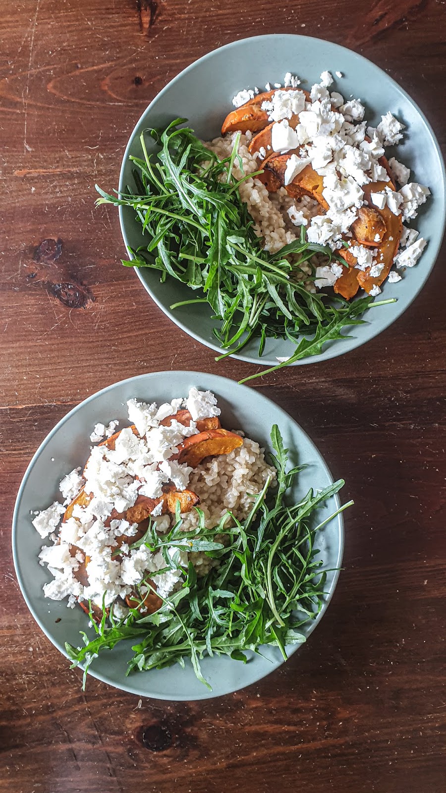Salada Quente de Arroz Integral, Abóbora Assada, Rucula e Queijo Feta