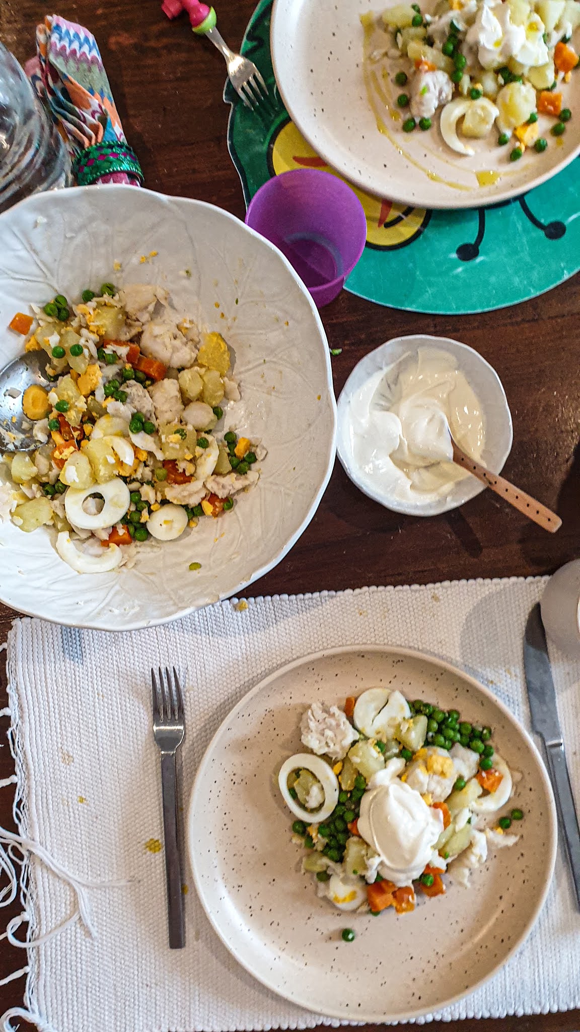 Aos poucos os hábitos voltam a instalar-se e as rotinas tornam-se novamente rotinas, apesar dos tempos estranhos em que vivemos, e da certeza de um novo confinante geral.Foi de um fim de semana calmo, em casa e com tempo para os miúdos e para cozinhar. E no sábado, o meio da azáfama da manhã, saiu um almoço muito apreciado cá em casa: salada russa. Em vez de atum, com pescada ( e com um twist) e com uma maionese complementada com iogurte grego.Básico mas bom, Não sobrou nada para contra a história!Boa semana a todos!