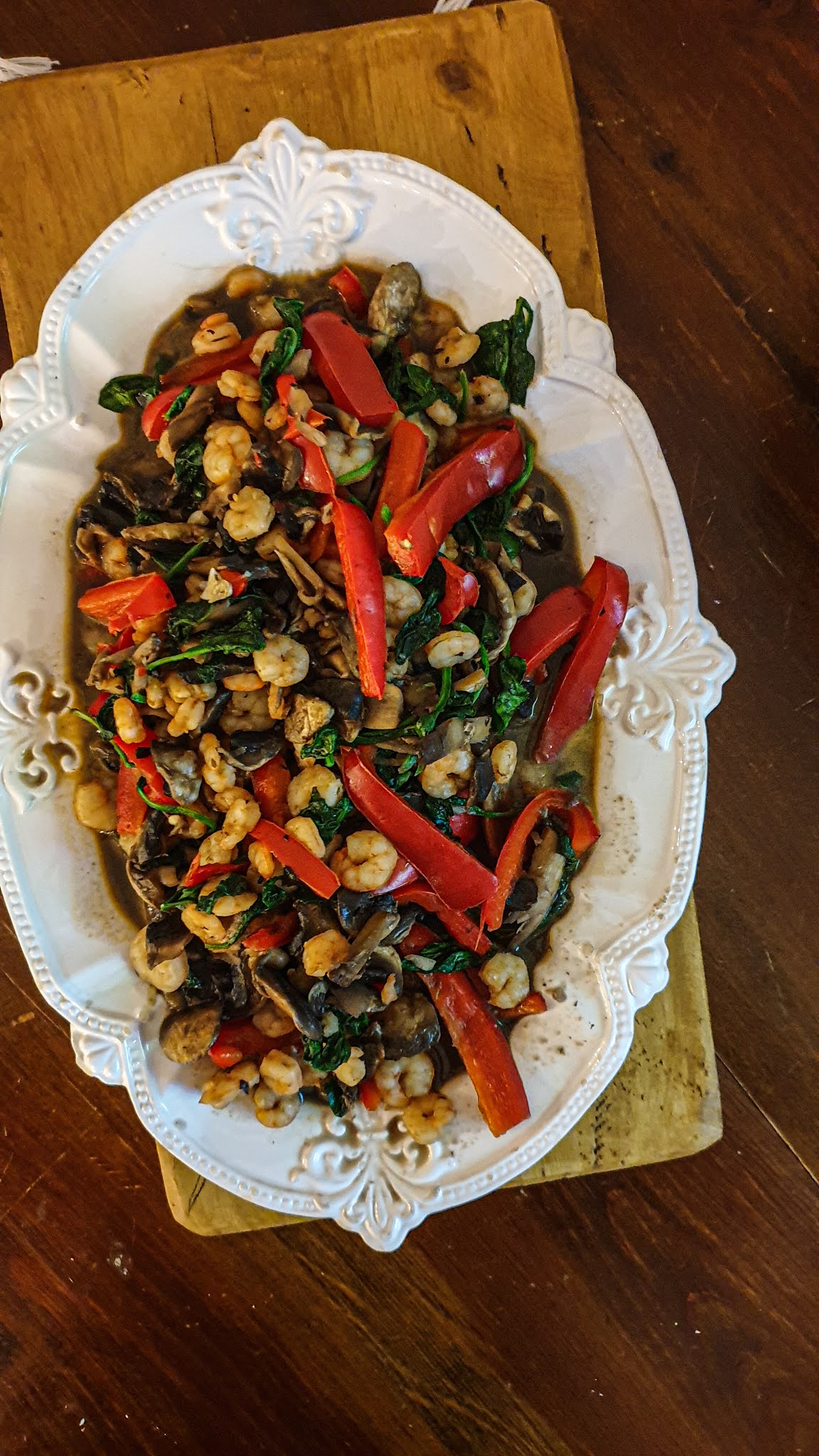 Salteado de Camarão com Cogumelos, Espinafres e Pimento