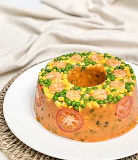 Modo de preparo:1. Coloque um recipiente sobre a tampa da Thermomix e pese 50g de ervilhas frescas, 50g de milho verde. Retire e reserve junto com o tomate em rodelas.2. No copo limpo e seco, coloque a salsinha e pulverize 2 seg/Vel 7. Retire e reserve.3. Sem lavar o copo, coloque o alho, a cebola e triture 5 seg/Vel 5. Baixe o que ficou na lateral do copo, adicione o azeite e refogue 5 min/Varoma/Vel 1.4. Adicione 100g de ervilha fresca, 100g de milho verde, a páprica, o colorau, as azeitonas, o molho de tomate, a água, o sal, a pimenta do reino e cozinhe 7 min/Varoma/Inversa/Vel 1.5. Adicione os camarões e cozinhe 5 min/Varoma/Inversa/Vel Colher. Retire alguns camarões para a decoração e reserve. No copo, prove os temperos e ajuste o sal se for necessário.6. Adicione a salsinha reservada, a cebolinha e a farinha de milho. Misture com ajuda da espátula e cozinhe 8 min/Varoma/Inversa/Vel 1.7. Unte bem com azeite uma forma com furo central (24 cm), dec...