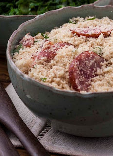 100 g cebola descascada2 dentes de alho descascado30 g óleo de girassol50 g bacon, cortado em cubos (aprox. 2 cm x 2 cm)150 g linguiça calabresa defumada, cortada em rodelas finas300 g farinha de mandioca crua1/2 c. chá de sal20 g manteiga10 talos de cebolinha, picados
